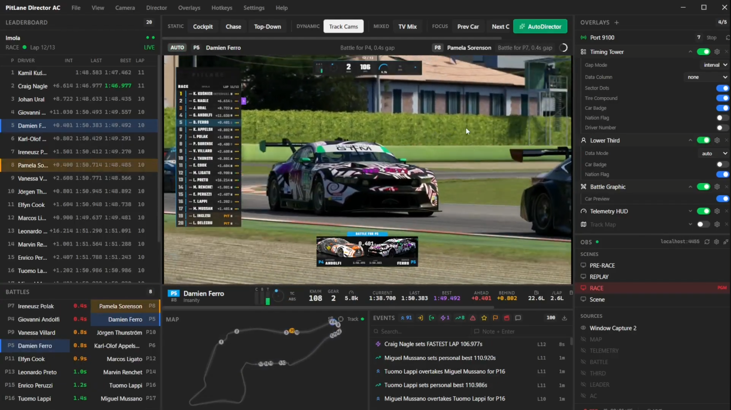 A desktop broadcast director for Assetto Corsa sim racing leagues that gives one operator full control of camera, timing, and on-air graphics without ever touching the sim's window. Built on Electron with a CSP Lua sidecar feeding live session data and executing camera commands, a local overlay server with broadcast-grade OBS overlays, and direct OBS integration for scene and replay control.
